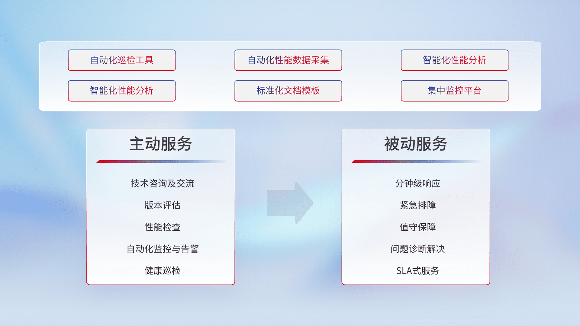 智能化工具和标准化文档,,,,保障服务质量,,提供主动服务(包含技术咨询、、版本评估、、、性能检查、、、、自动化监控与告警、、、健康巡检)和被动服务包含(分钟级响应、、紧急排障、、值守保障、、、问题诊断解决、、、、SLA服务)。。。。